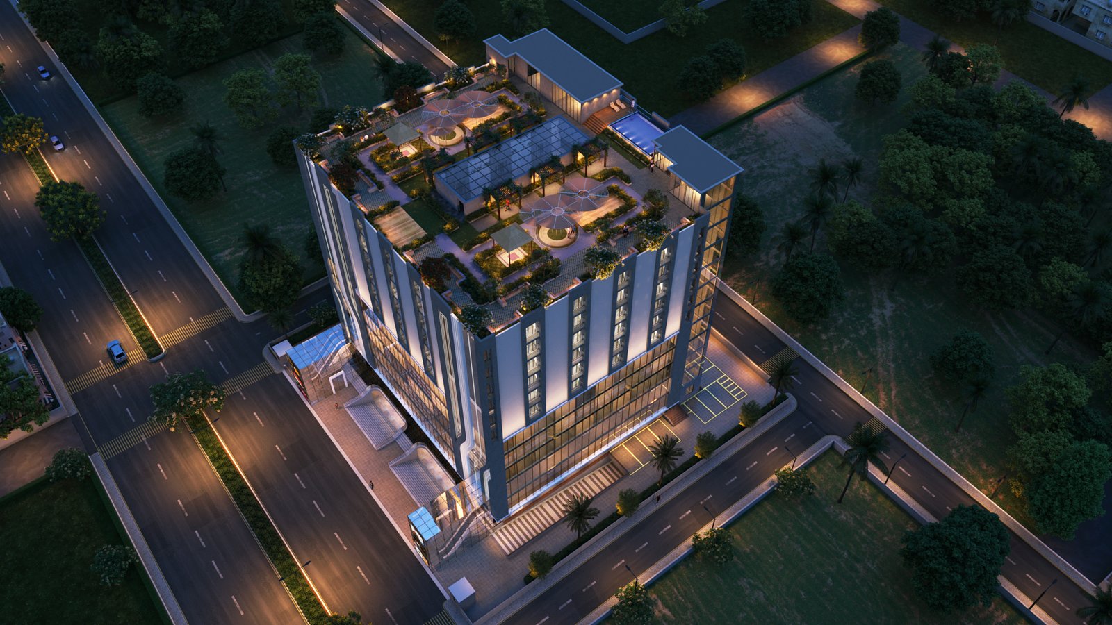 The chief features include a three-side open floor plan, retail floors, corporate office space, studio apartments with indoor gaming and gymnasium, food court, gaming area, and a well-planned rooftop garden with lounges and gazebos.